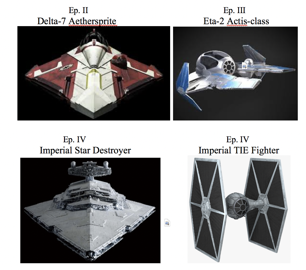 The Jedi Starfighter’s evolution into the Imperial TIE Fighter is one example of how Lucas used this design philosophy in his worldbuilding5. In Episode I, the Jedi arrive on a Consular Republic Cruiser. Absent from this movie are Jedi ships. Obi-Wan Kenobi’s Delta-7Aethersprite-class light interceptor isn’t introduced until Episode II. It’s a small wedge-shaped single pilot ship. This Starfighter evolves into theEta-2 Actis-class interceptorin Episode III. Notable is the cockpit design foreshadowing the original 1977TIE Fighter. Moreover, the small Delta-7 evolves into a gigantic Imperial Star Destroyer for Episode IV.