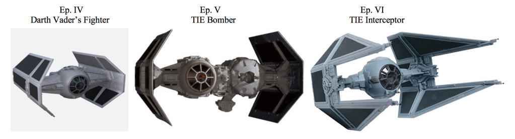 This ‘constant innovation’ appears in the original trilogy (OT) with Darth Vader’s fighter, the TIE Bomber and the TIE Interceptor, introduced in each of the sequels.