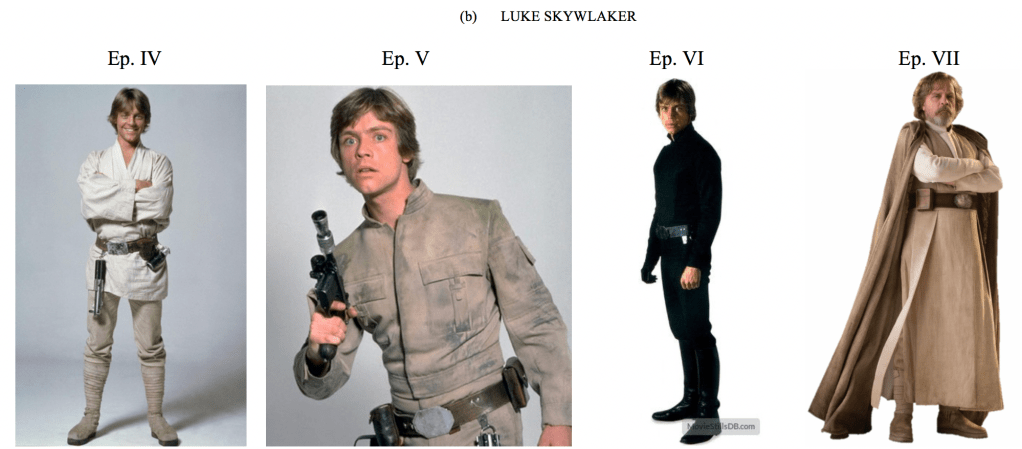 In the OT and prequels, George Lucas made sure that his characters evolved by designing costume changes. The color pallet for Obi-wan Kenobi (a) and Luke (b) follow a similar path. Both characters begin in white, indicating their naiveté. In the second movie their costumes become shades darker expressing experience. But by their third appearance a divergence in color schemes is obvious. Obi-Wan’s trousers are darker and his under-tunic brown. Obi-Wan doesn’t question the Jedi Council. He doesn’t seek “answers”. He’s a good soldier who follows orders. That includes watching over Luke on Tatooine for the next nineteen years.