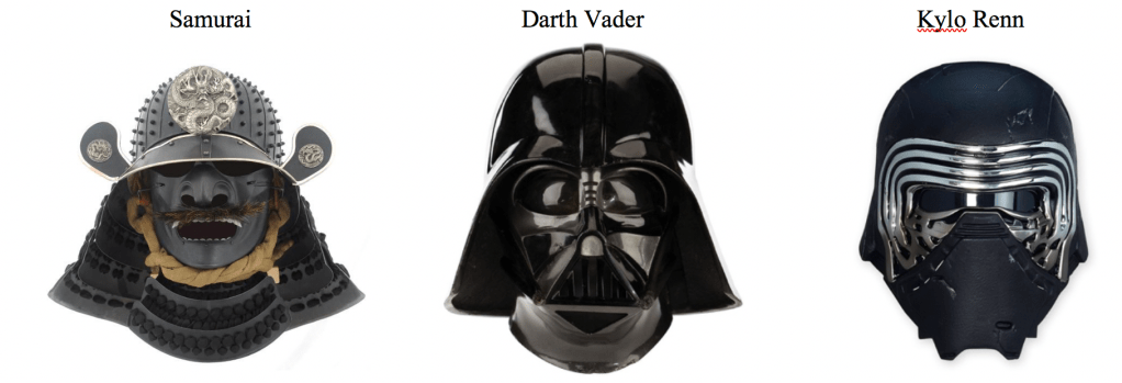 Knowledge is forbidden. In the Book of Genesis, Adam and Eve commit original sin by eating from the Tree of Knowledge. In Return of the JediLuke’s knowledge grows deeper, but his victory is refusing the Emperor’s temptation to join the Dark Side. Consequently, Abrams has him in Episode VII transition back into browns. This is not a total violation of character design, and his seclusion is the only thing that actually makes sense in TFA. Luke is now the wise man on top of the mountain. Despite getting Luke Skywalker correct, the design of Kylo Renn’s helmet is an aberration and obvious theft of Darth Vader’s samurai skull helmet. The difference is function. While Vader needed his helmet to breathe, Kylo’s mask serves no purpose.