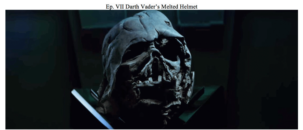 Just as ridiculous is Kylo Renn’s shrine to Darth Vader. Luke cremated his father in a funeral pyre on the moon of Endor in Return of the Jedi. Apparently Kylo Renn was drawn to Vader’s melted helmet by it’s “dark energy”. Is this supposed to explain why he wears his own “Ridiculous” mask? This obsession with Darth Vader by Kylo and Snoke is fundamentally misguided and illogical. Why not worship the true master of the Dark Side, Emperor Palpatine, rather than his flunkie?